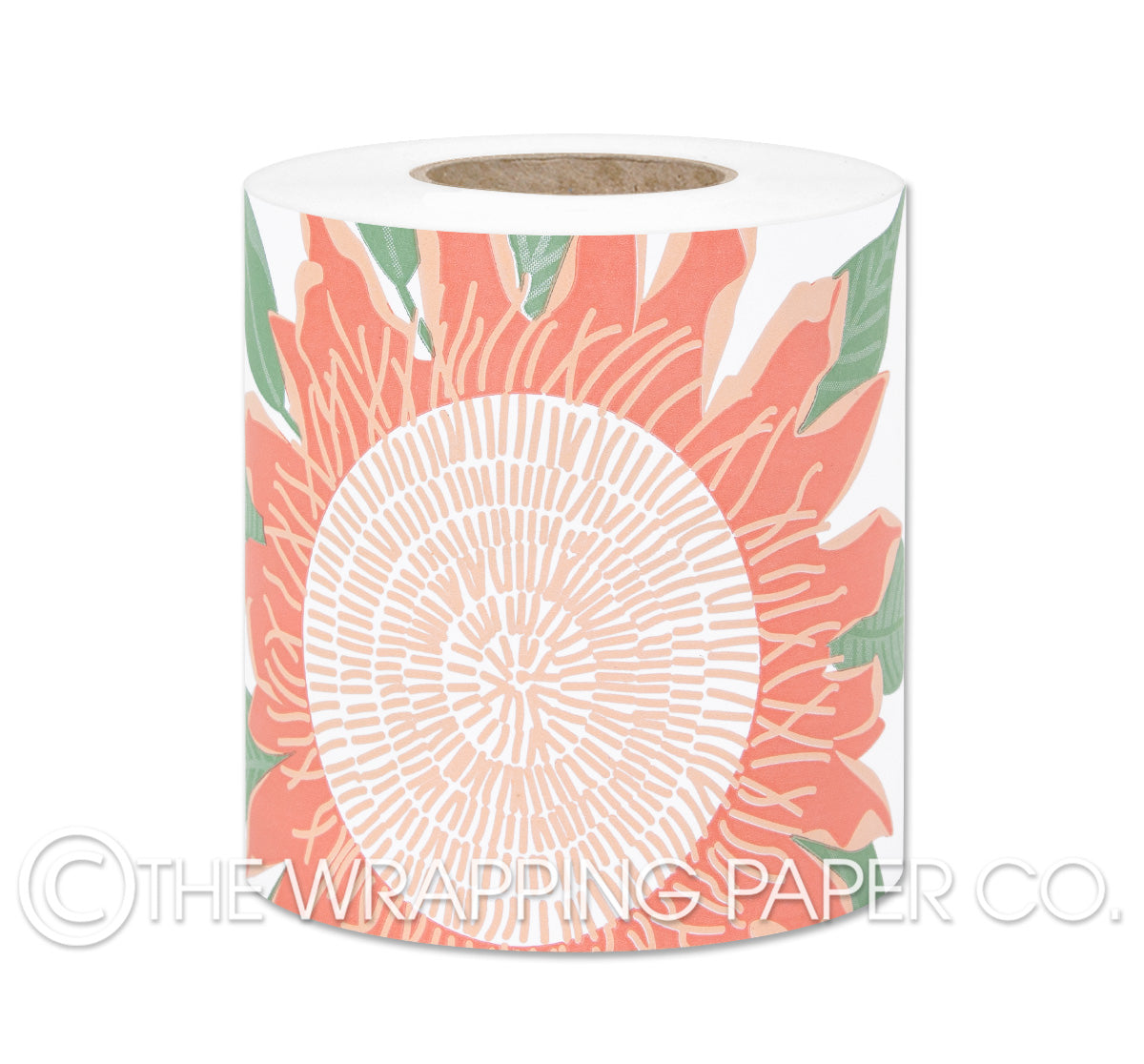 KING PROTEA Belli-Band® 90mm x 50 mtr. Designed & Manufactured in Australia using strong 80gsm matt white paper sourced from certified sustainable plantation forests. A Belli-Band is a paper strip of gift wrap used as a decorative embellishment when gift wrapping. All designs are Copyright of The Wrapping Paper Co.