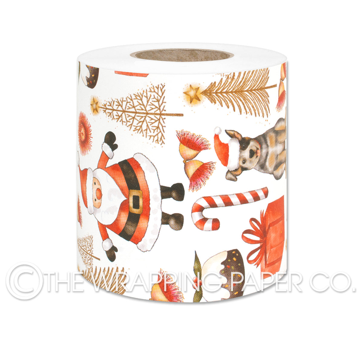 BUSH XMAS Belli-Band® 90mm x 50 mtr. Designed & Manufactured in Australia using strong 80gsm matt white paper sourced from certified sustainable plantation forests. A Belli-Band is a paper strip of gift wrap used as a decorative embellishment when gift wrapping. Designed & Illustrated by Carolyn Dam. All designs are Copyright of The Wrapping Paper Co.