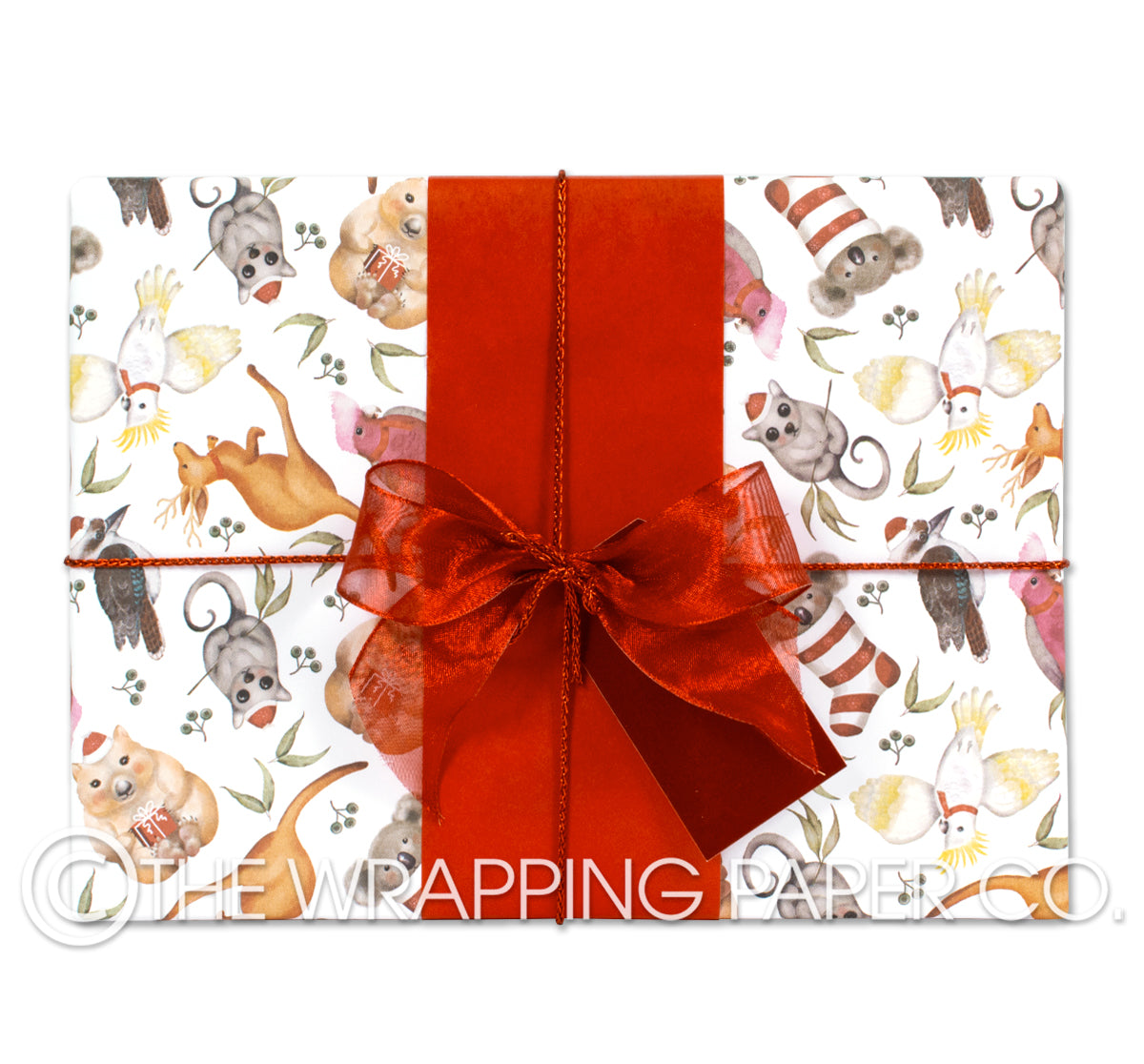 BUSH XMAS wrapping paper counter roll 500 mm x 50 mtr gift wrapping paper. Designed & Manufactured in Australia using strong 80gsm matte white paper sourced from certified sustainable plantation forests. Designed & Illustrated by Carolyn Dam. All designs are Copyright of The Wrapping Paper Co.