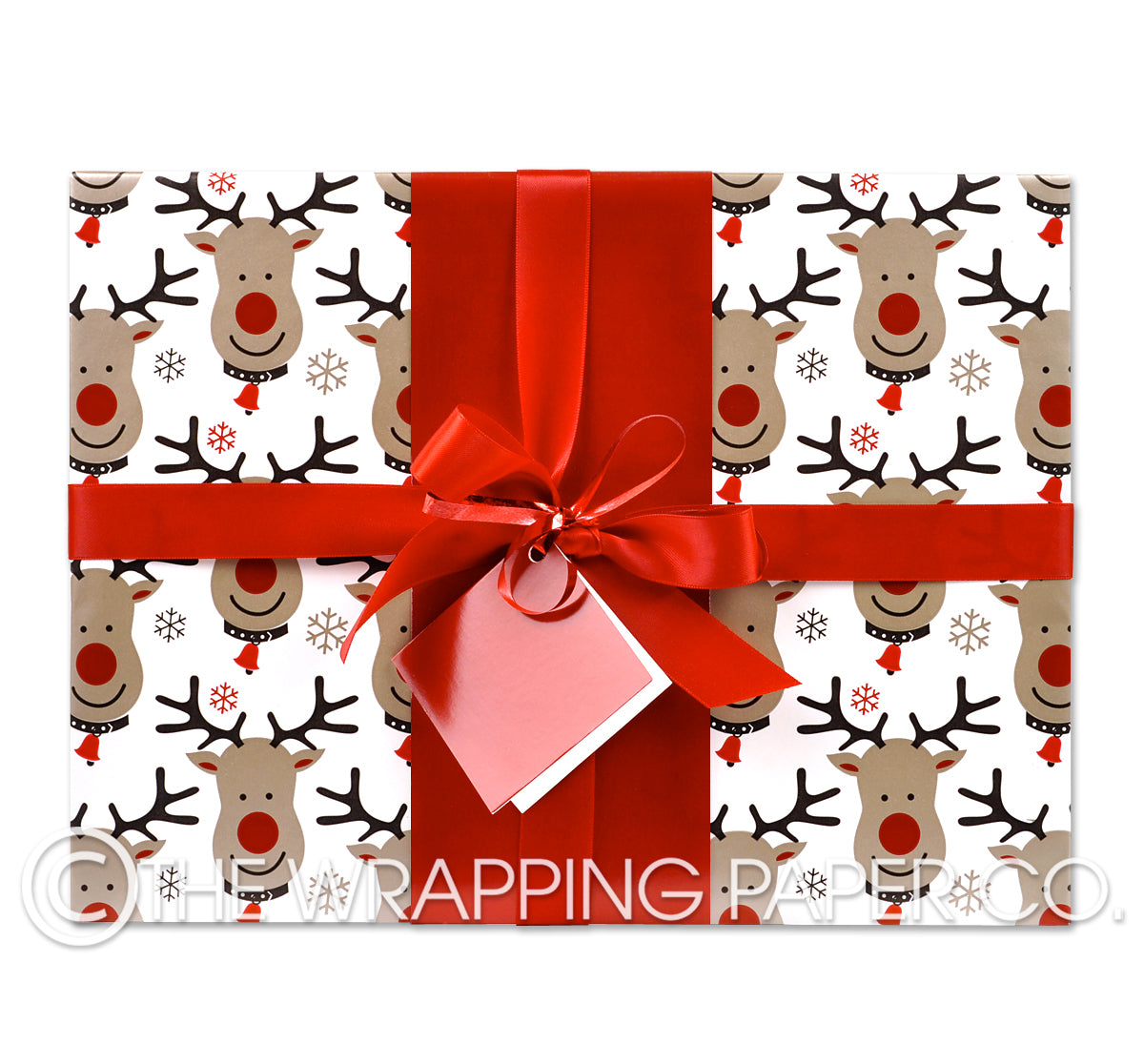 RUDOLPH Christmas wrapping paper counter roll 500 mm x 50 mtr gift wrapping paper. Designed & Manufactured in Australia using strong 80gsm semi gloss white paper sourced from certified sustainable plantation forests. All designs are Copyright of The Wrapping Paper Co.