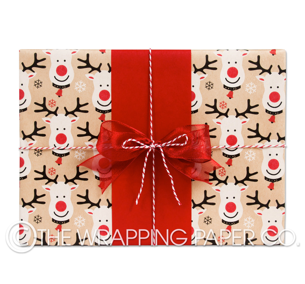 RUDOLPH KRAFT Christmas wrapping paper counter roll 500 mm x 50 mtr gift wrapping paper. Designed & Manufactured in Australia using strong 60gsm matte unbleached brown kraft paper sourced from certified sustainable plantation forests. All designs are Copyright of The Wrapping Paper Co.