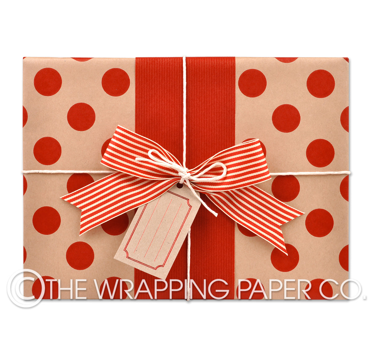 LARGE RED DOT KRAFT wrapping paper counter roll 500 mm x 50 mtr gift wrapping paper. Designed & Manufactured in Australia using strong 60gsm matte brown kraft paper sourced from certified sustainable plantation forests. All designs are Copyright of The Wrapping Paper Co.