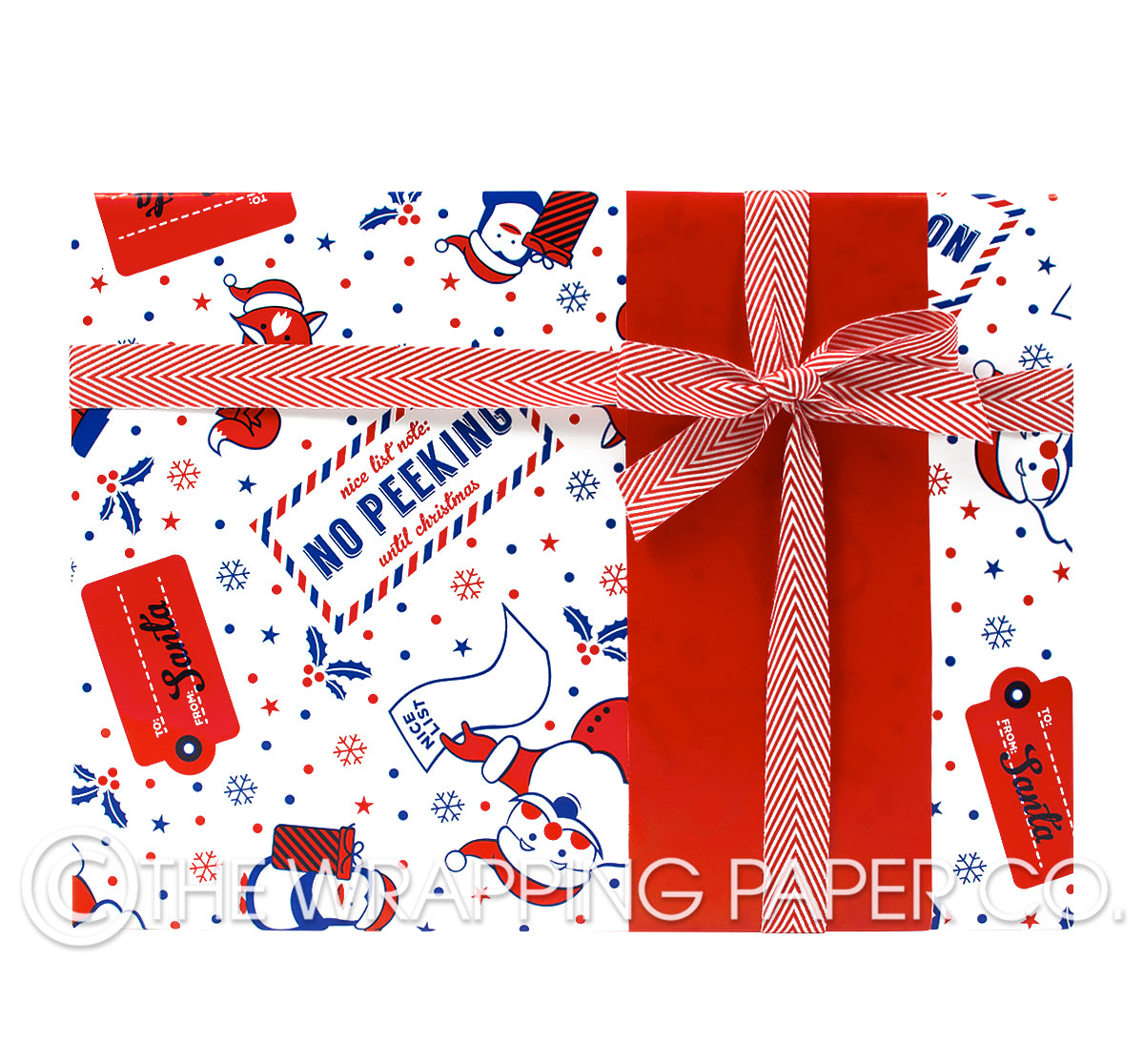 NO PEEKING Christmas wrapping paper counter roll 500 mm x 50 mtr gift wrapping paper. Designed & Manufactured in Australia using strong 80gsm semi gloss white paper sourced from certified sustainable plantation forests.  All designs are Copyright of The Wrapping Paper Co.