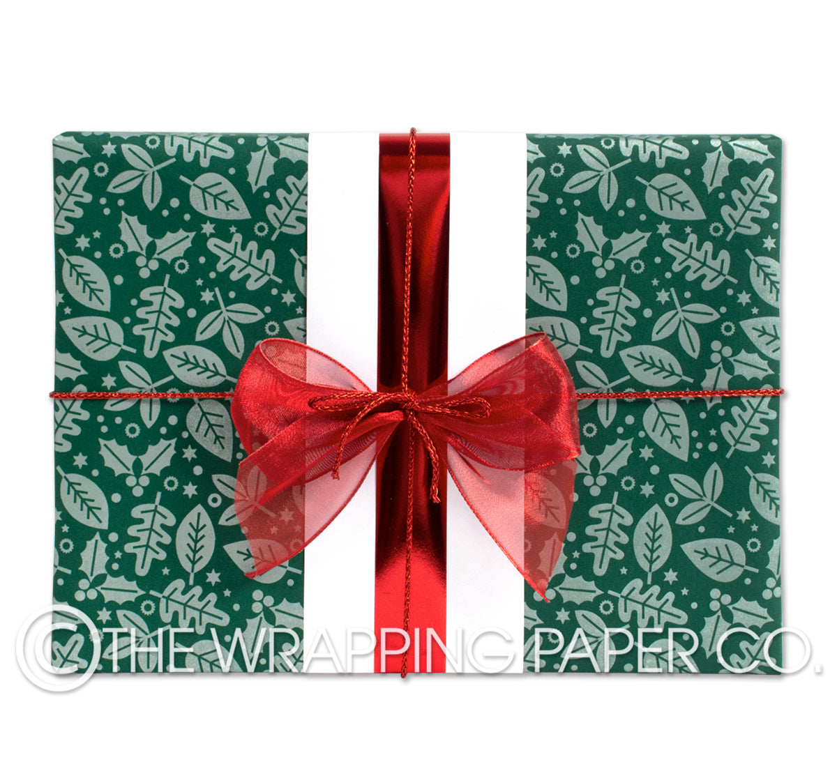 YULE FOREST GREEN wrapping paper counter roll 500 mm x 50 mtr gift wrapping paper. Designed & Manufactured in Australia using strong 80gsm matte white paper sourced from certified sustainable plantation forests. All designs are Copyright of The Wrapping Paper Co.
