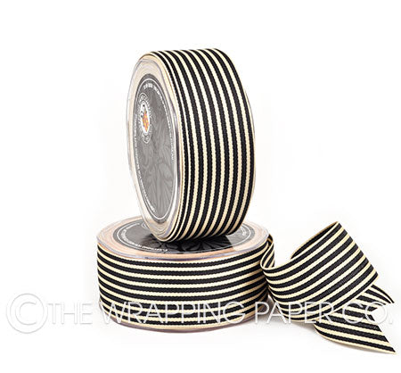Black and Cream 38mm Grosgrain. Size 38mm x 27m. Manufactured using man made fibre. Country of origin Taiwan.