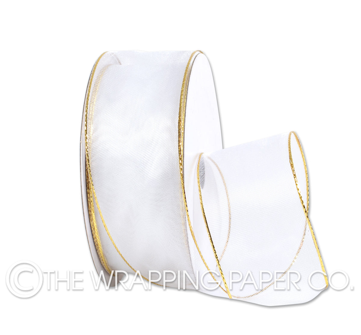 Size 38mm x 9m. Woven wired edge organza with a gold edge. Country of origin Taiwan.