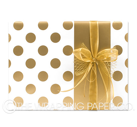 EW LARGE DOT GOLD Extra Wide Roll. Extra Wide Roll 740mm x 100m. Designed & Manufactured in Australia using strong 80gsm gloss white paper sourced from certified sustainable plantation forests. All designs are Copyright of The Wrapping Paper Co.