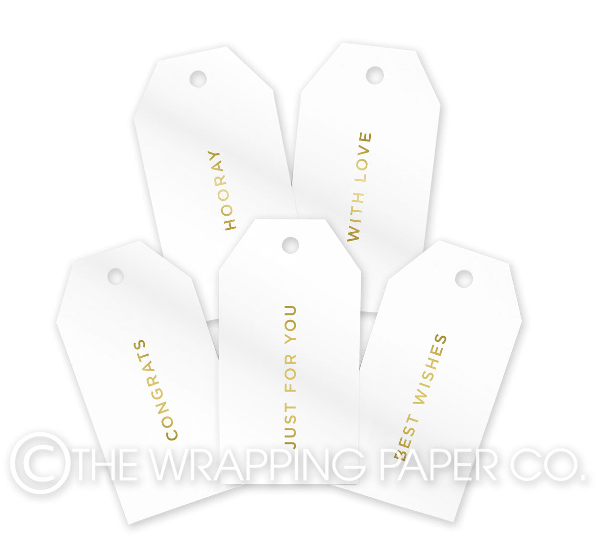 MESSAGE GOLD FOIL ON WHITE TAGS. Size 95mm x 50mm. Letterpress gold foil printed on gloss white tag stock. Designed & Manufactured in Australia. Quantity 30 tags. Pack consists of 6 x Congrats, 6 x Just For You, 6x Best Wishes, 6 x Hooray, 6 x With Love. Printed on white gloss card.