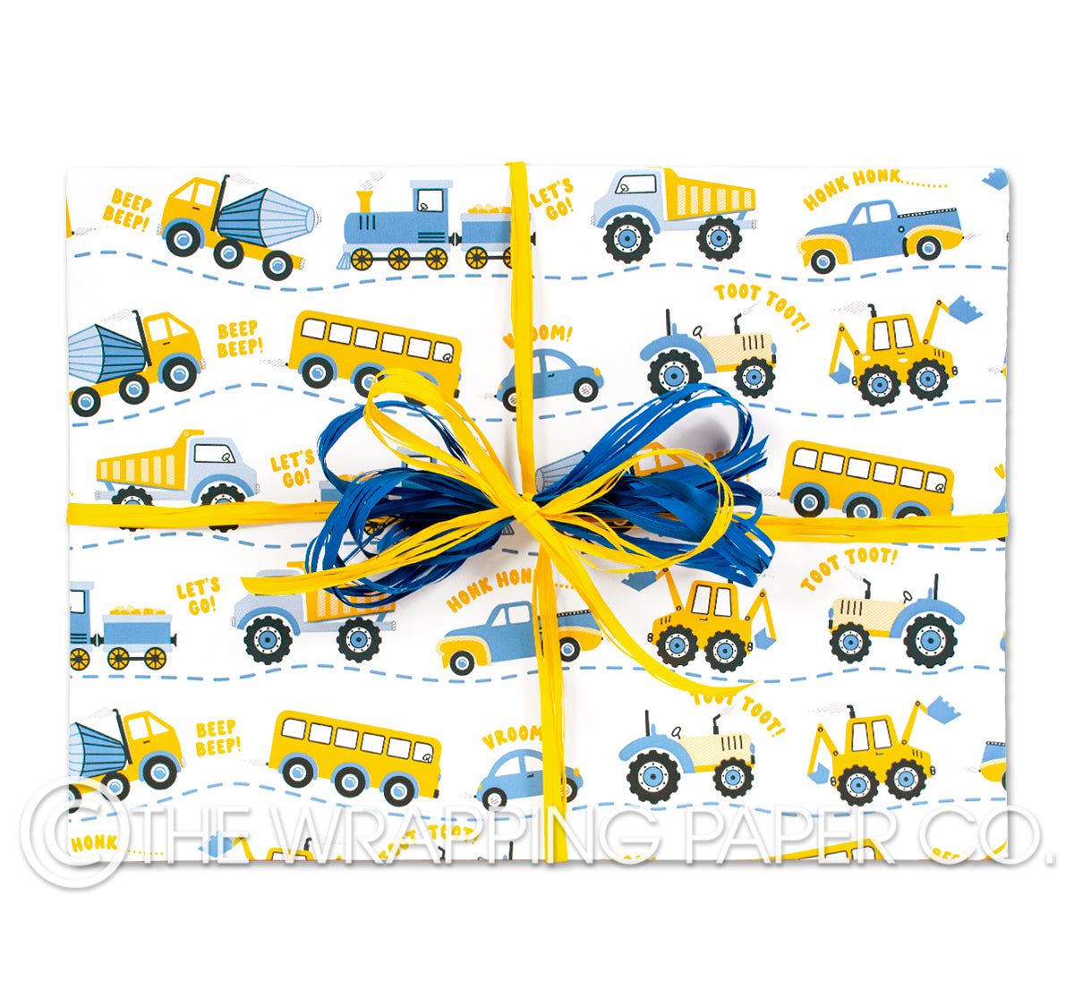 TRANSPORT wrapping paper counter roll 500 mm x 50 mtr gift wrapping paper. Designed & Manufactured in Australia using strong 80gsm semi gloss white paper sourced from certified sustainable plantation forests. All designs are Copyright of The Wrapping Paper Co.